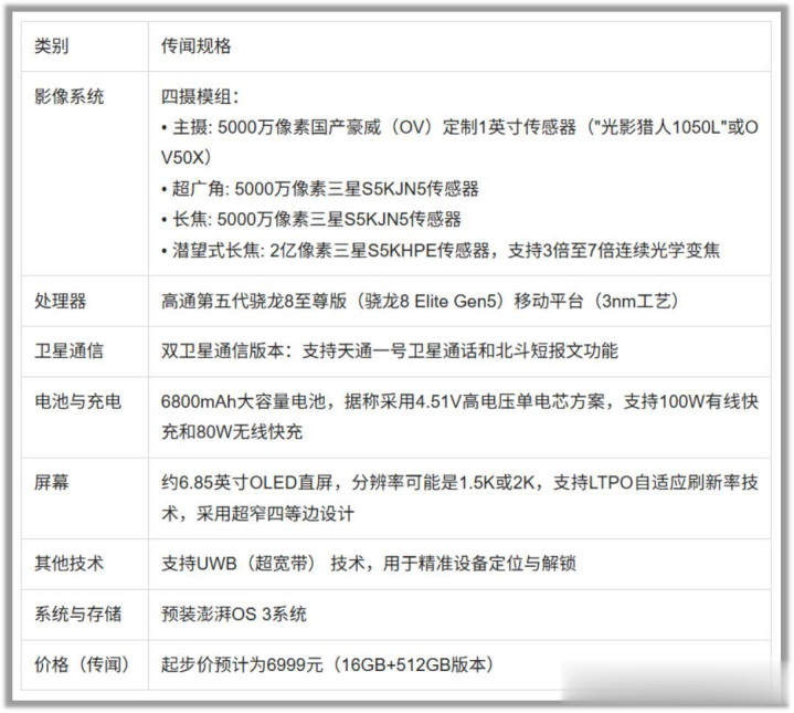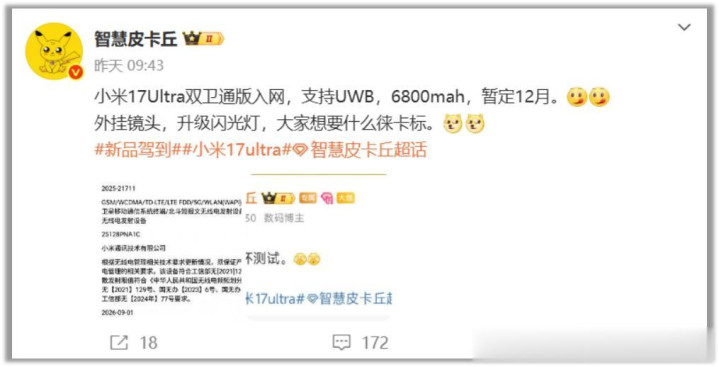 数码博主智慧皮卡丘表示:“小米17Ultra双卫通版入网,支持UWB,6800mah,外挂镜头,升级闪光灯,暂定12月。”