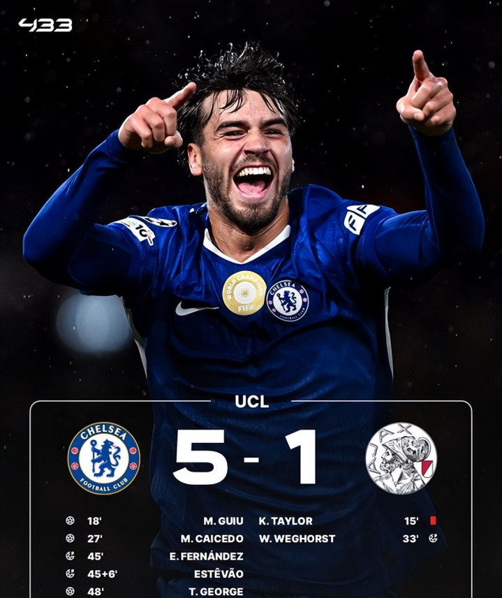 从吉乌,凯塞多、恩佐和埃斯特旺以及阿贾克斯在第33分钟由韦霍斯特的进球,双方其实在上半场就已经打出了4-1的比分。而到了下半场第48分钟乔治的进球,切尔西最终在主场5-1轻取阿贾克斯拿到了最终胜利。