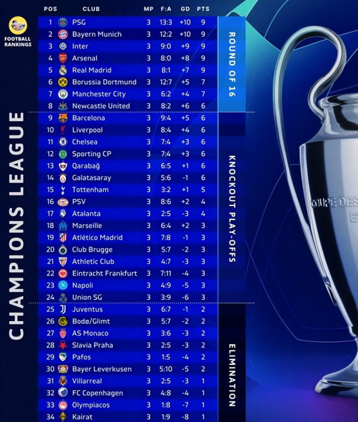 在目前的最新积分榜中,巴黎、拜仁、国米、阿森纳和皇马这5支3战全胜的球队,暂列积分榜的第1-5名。而多特,曼城和纽卡则暂列第6-8位。