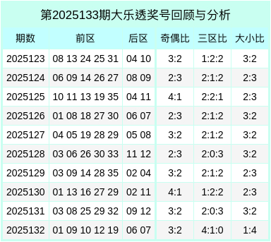 当期前区号码大小比为1:4,三区比为4:1:0,奇偶比为3:2。