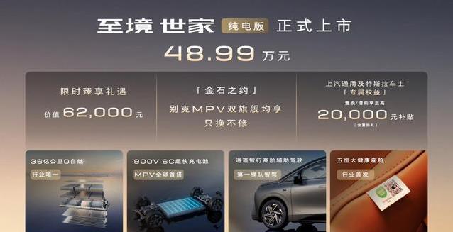 别克推出了一款全新的纯电多功能车,这款车叫至境世家纯电版,官方售价四十八点九九万元,只有一个奢享版车型。它延续了别墅级新能源旗舰多功能车的定位,继承了插混版的那些扎实本事,还加入了九百伏六倍快充电池、哑光灰双拼色的高级涂装,还有专门给特斯拉车主准备的换购优惠,以及其他一系列贴心的用户权益,让纯电出行的感觉一下子提升了不少。
